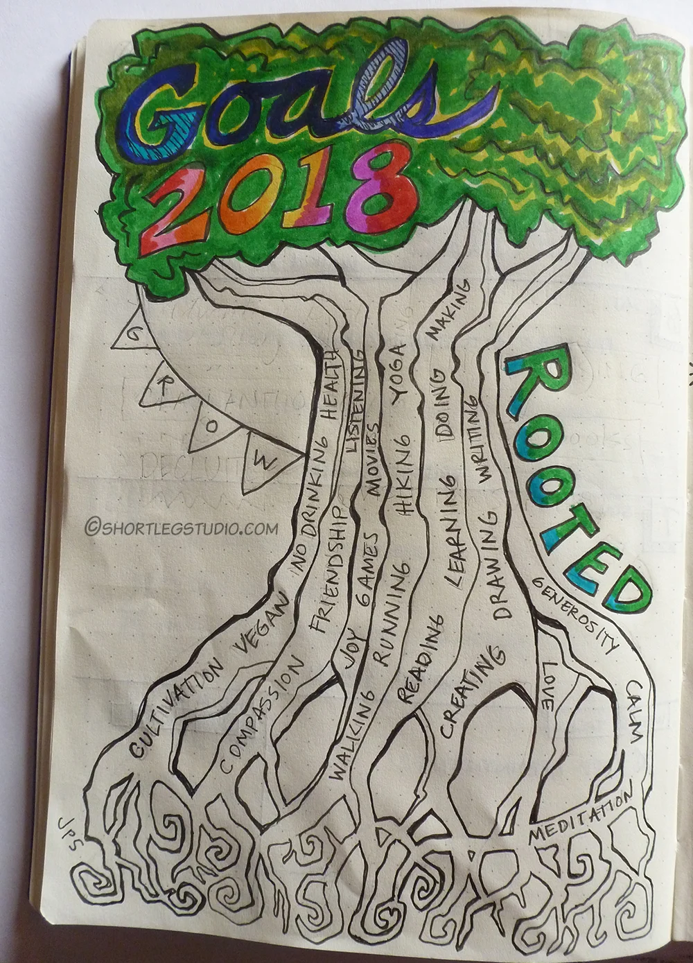 I listed words at the bottom roots of my tree as the base of all my ideas and goals for the year. Then, I added actions and ideas that related to each of my main roots. Now I see this as a more holistic approach to planning my year. I can always look back and see if I am living the words.